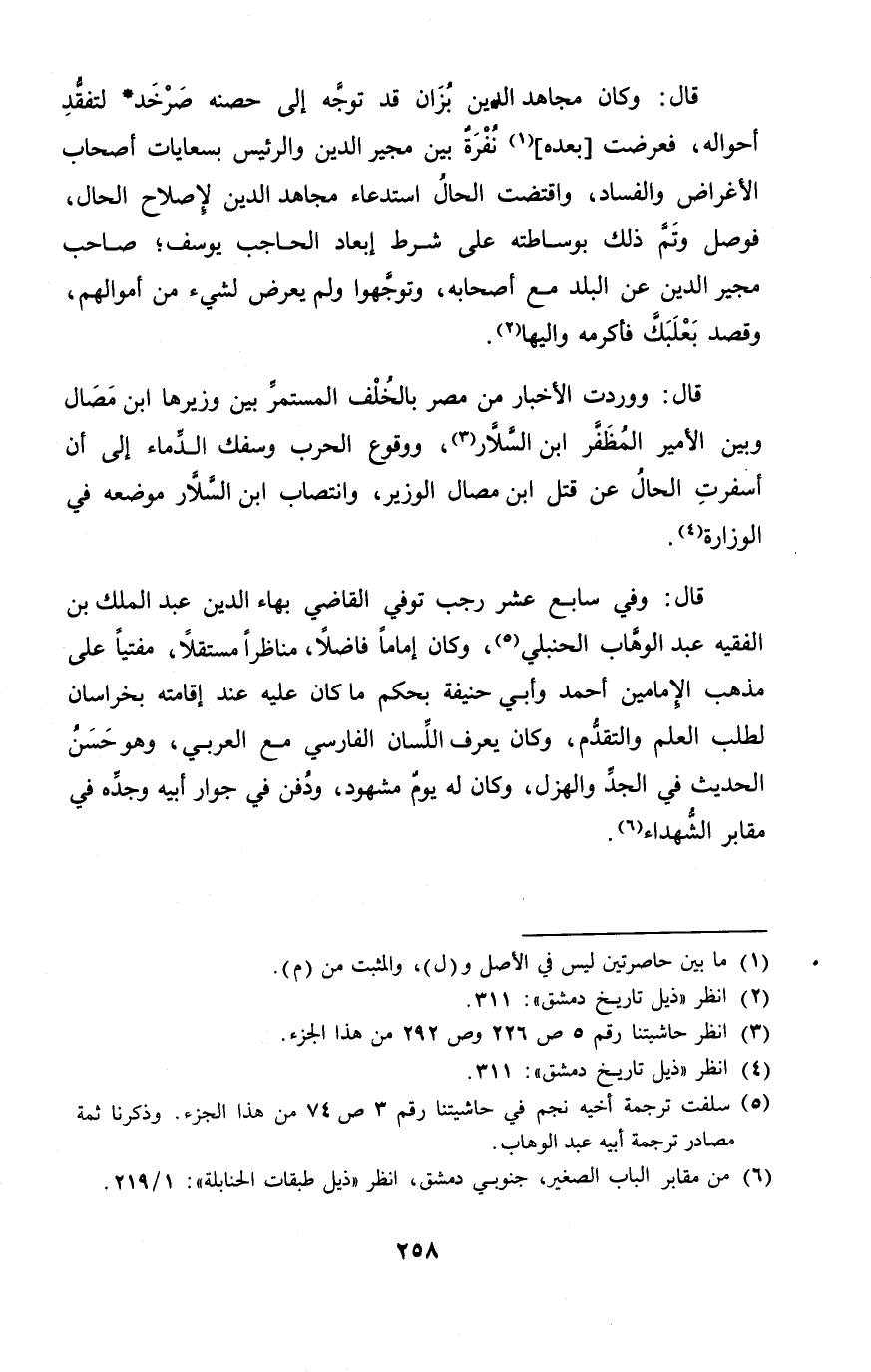 قَالَ وَفِي سَابِع عشر رَجَب توفى القَاضِي بهاء الدّين عبد الْملك بن الْفَقِيه عبد الْوَهَّاب الْحَنْبَلِيّ وَكَانَ إِمَامًا فَاضلا مناظرا مُسْتقِلّا مفتيا على مَذْهَب الْإِمَامَيْنِ أَحْمد وَأبي حنيفَة بِحكم مَا كَانَ عَلَيْهِ عِنْد إِقَامَته بخراسان لطلب الْعلم والتقدم وَكَانَ يعرف اللِّسَان الْفَارِسِي مَعَ الْعَرَبِيّ وَهُوَ حسن الحَدِيث فِي الْجد والهزل وَكَانَ لَهُ يَوْم مشهود وَدفن فِي جوَار أَبِيه وجده فِي مَقَابِر الشُّهَدَاء