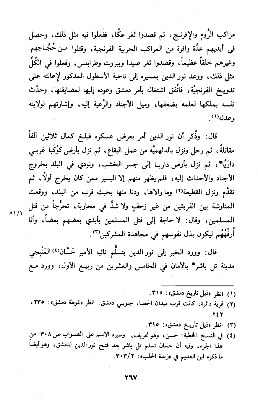 قَالَ وَذكر أَن نور الدّين أَمر بِعرْض عسكره فَبلغ كَمَال ثَلَاثِينَ ألفا مقاتلة ثمَّ رَحل وَنزل بالدلهمية من عمل الْبِقَاع ثمَّ نزل بِأَرْض كوكبا غربي دارَيّا ثمَّ نزل بارض دارَيّا إِلَى جسر الْخشب وَنُودِيَ فِي الْبَلَد بِخُرُوج الأجناد والأحداث إِلَيْهِ فَلم يظْهر مِنْهُم إِلَّا الْيَسِير مِمَّن كَانَ يخرج أَولا ثمَّ تقدم وَنزل القطيعة وَمَا والاها ودنا مِنْهَا بِحَيْثُ قرب من الْبَلَد وَوَقعت المناوشة بَين الْفَرِيقَيْنِ من غير زحف وَلَا شدّ فِي محاربة تحرجا من قتل الْمُسلمين وَقَالَ لَا حَاجَة إِلَى قتل الْمُسلمين بأيدي بَعضهم بَعْضًا وَأَنا أرفُههم ليَكُون بذل نُفُوسهم فِي مجاهدة الْمُشْركين