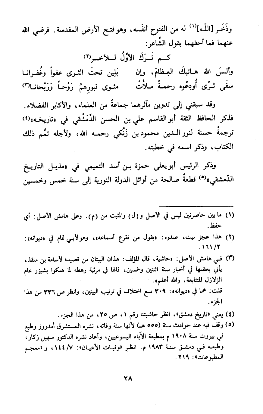 وَذكر الرئيس أَبُو يعلى حَمْزَة بن أَسد التَّمِيمِي فِي مذيل التَّارِيخ الدِّمَشْقِي قِطْعَة صَالِحَة من أَوَائِل الدولة النورية إِلَى سنة خمس وَخمسين