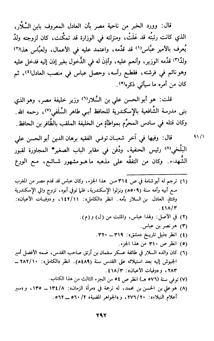 قَالَ وَورد الْخَبَر من نَاحيَة مصر بِأَن الْعَادِل الْمَعْرُوف بِابْن السّلار الَّذِي كَانَت رتبته قد علت ومنزلته فِي الوزارة قد تمكنت كَانَ لزوجته ولد يعرف بالأمير عَبَّاس قد قدمه وَاعْتمد عَلَيْهِ فِي الْأَعْمَال ولعباس هَذَا ولد قدمه الْوَزير وأنعم عَلَيْهِ وَأذن لَهُ فِي الدُّخُول بِغَيْر إِذن إِلَيْهِ فَدخل عَلَيْهِ وَهُوَ نَائِم فِي فرشته فَقطع رَأسه وَحصل عّباس فِي منصب الْعَادِل ثمَّ كَانَ من أمره مَا سَيَأْتِي ذكره