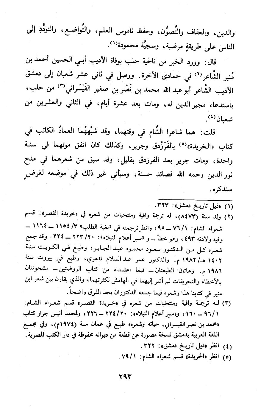 قلت هما شَاعِرًا الشَّام فِي وقتهما وَقد شبههما الْعِمَاد الْكَاتِب فِي = كتاب الخريدة = بالفرزدق وَجَرِير وَكَذَلِكَ كَانَ اتّفق مَوْتهمَا فِي سنة وَاحِدَة وَمَات جرير بعد الفرزدق بِقَلِيل وَقد سبق من شعرهما فِي مدح نور الدّين رَحمَه الله قصائد حَسَنَة وَسَيَأْتِي غير ذَلِك فِي مَوْضِعه لغَرَض سَنذكرُهُ