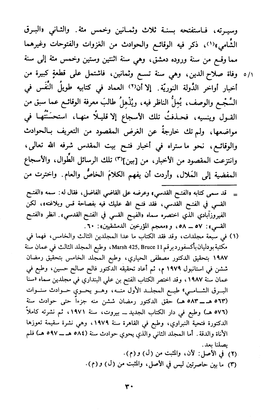 وَسيرَته فاستفتحه بِسنة ثَلَاث وَثَمَانِينَ وَخمْس مئة وَالثَّانِي الْبَرْق الشَّامي ذكر فِيهِ الوقائع والحوادث من الْغَزَوَات والفتوحات وَغَيرهمَا مِمَّا وَقع من سنة وُرُوده دمشق وَهِي سنة اثْنَتَيْنِ وَسِتِّينَ وَخمْس مئة إِلَى سنة وَفَاة صَلَاح الدّين وَهِي سنة تسع وَثَمَانِينَ فَاشْتَمَلَ على قِطْعَة كَبِيرَة من أَخْبَار أَوَاخِر الدولة النورية إِلَّا أَن الْعِمَاد فِي كِتَابيه طَوِيل النَّفس فِي السجع وَالْوَصْف يمل النَّاظر فِيهِ وَيذْهل طَالب معرفَة الوقائع عَمَّا سبق من القَوْل وينسيه فحذفت تِلْكَ الأسجاع إِلَّا قَلِيلا مِنْهَا استحسنتها فِي موَاضعهَا وَلم تَكُ خَارِجَة عَن الْغَرَض الْمَقْصُود من التَّعْرِيف بالحوادث والوقائع نَحْو مَا ستراه فِي أَخْبَار فتح بَيت الْمُقَدّس شرفه الله تَعَالَى وانتزعت الْمَقْصُود من الْأَخْبَار من بَين تِلْكَ الرسائل الطوَال والأسجاع المفضية إِلَى الملال وَأَرَدْت أَن يفهم الْكَلَام الْخَاص وَالْعَام واخترت من