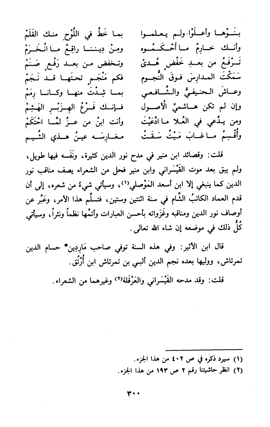 قلت وقصائد ابْن مُنِير فِي مدح نور الدّين كَثِيرَة وَنَفسه فِيهَا طَوِيل وَلم يبْق بعد موت القيسراني وَابْن مُنِير فَحل من الشُّعَرَاء يصف مَنَاقِب نور الدّين كَمَا يَنْبَغِي إِلَّا ابْن أسعد الموصلى وَسَيَأْتِي شَيْء من شعره إِلَى أَن قدم الْعِمَاد الْكَاتِب الشَّام فِي سنة اثْنَتَيْنِ وَسِتِّينَ فتسلم هَذَا الْأَمر وَعبر عَن أَوْصَاف نور الدّين ومناقبه وغزواته بِأَحْسَن الْعبارَات وأتمها نظما ونثرا وَسَيَأْتِي كل ذَلِك فِي مَوْضِعه إِن شَاءَ الله تَعَالَى