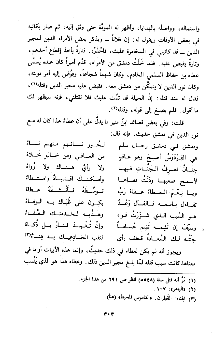 وَيجوز أَنه لم يكن لعطاء فِي ذَلِك حَدِيث وَإِنَّمَا هَذِه الأبيات أَو مَا فِي مَعْنَاهَا كَانَت سَبَب قَتله لما بلغ مجير الدّين ذَلِك