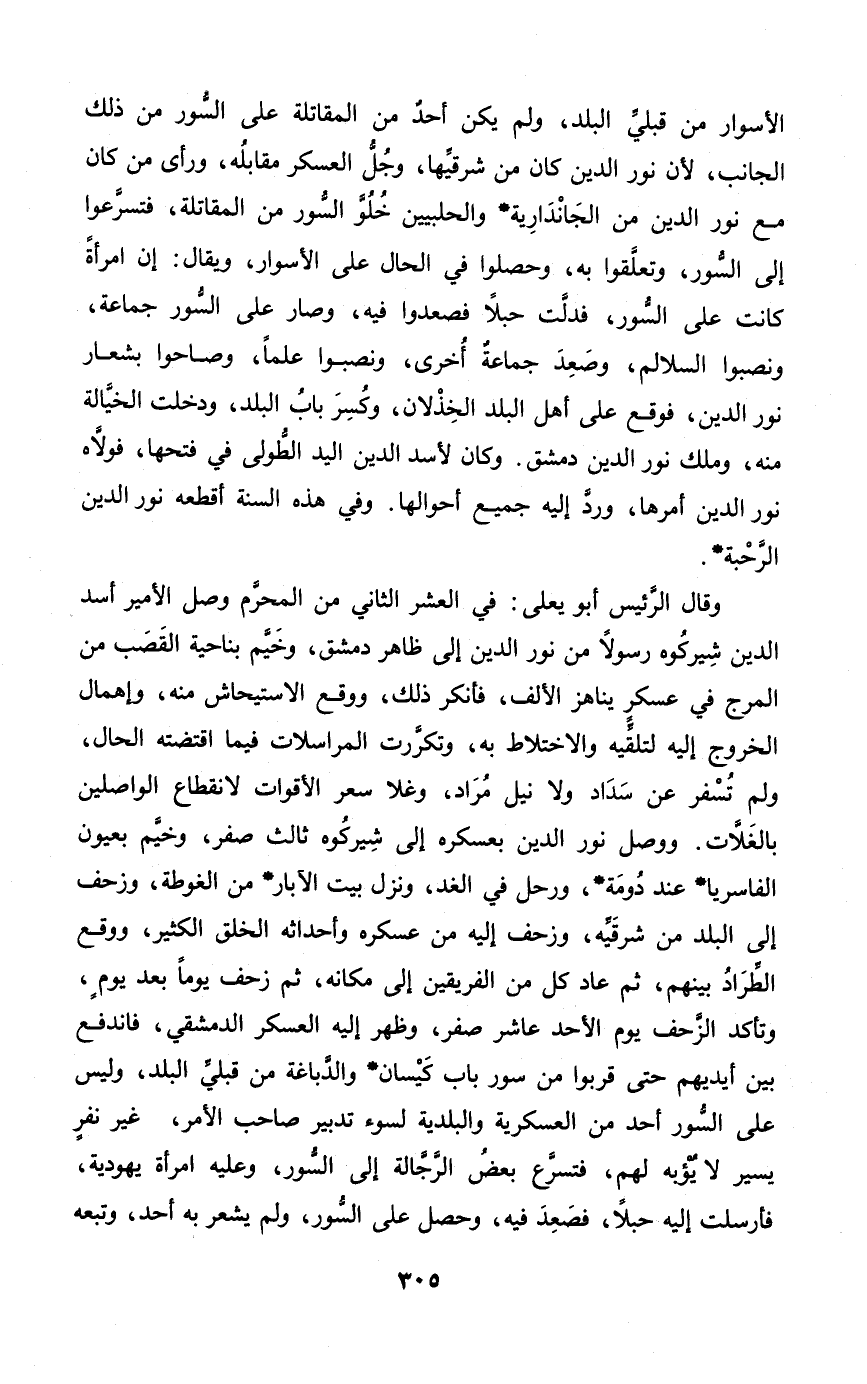 الأسوار من قبلي الْبَلَد وَلم يكن أحد من الْمُقَاتلَة على السُّور من ذَلِك الْجَانِب لِأَن نور الدّين كَانَ من شرقيها وَجل الْعَسْكَر مُقَابِله وَرَأى من كَانَ مَعَ نور الدّين من الجاندارية والحلبيين خلو السُّور من الْمُقَاتلَة فتسرعوا إِلَى السُّور وتعلقوا بِهِ وحصلوا فِي الْحَال على الأسوار وَيُقَال إِن امْرَأَة كَانَت على السُّور فدلت حبلا فَصَعِدُوا فِيهِ وَصَارَ على السُّور جمَاعَة ونصبوا السلالم وَصعد جمَاعَة أُخْرَى ونصبوا علما وصاحوا بشعار نور الدّين فَوَقع على أهل الْبَلَد الخذلان وَكسر بَاب الْبَلَد وَدخلت الخيالة مِنْهُ وَملك نور الدّين دمشق