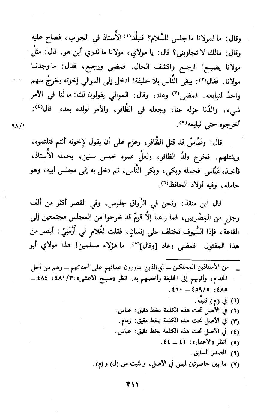 قَالَ ابْن منقذ وَنحن فِي الرواق جُلُوس وَفِي الْقصر أَكثر من ألف رجل من المصريين فَمَا رَاعنا إِلَّا قوم قد خَرجُوا من الْمجْلس مُجْتَمعين إِلَى القاعة فَإِذا السيوف تخْتَلف على إِنْسَان فَقلت لغلام لي أرمني ابصر من هَذَا الْمَقْتُول