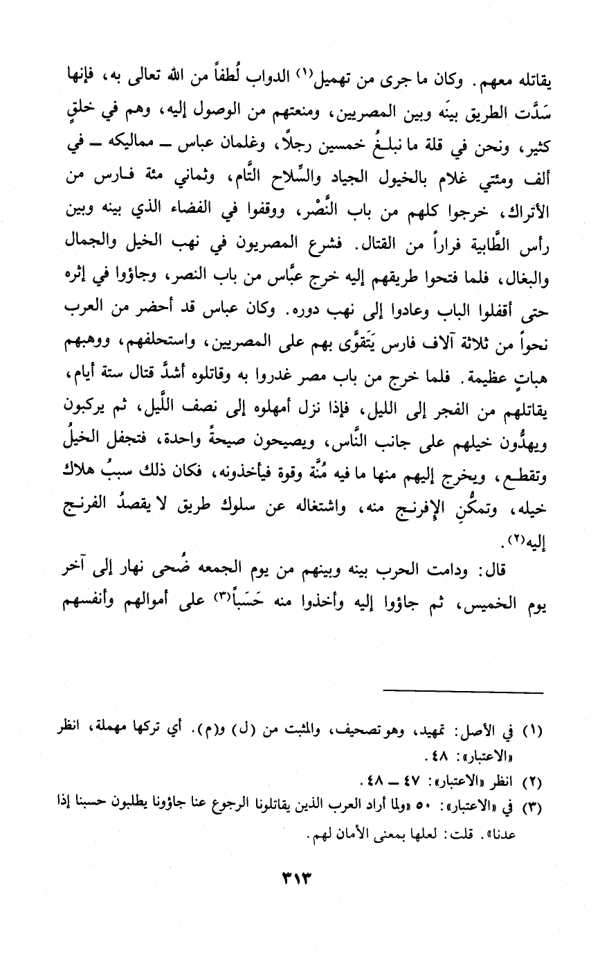 وَكَانَ مَا جرى من تهميل الدَّوَابّ لطفا من الله تَعَالَى بِهِ فَإِنَّهَا سدت الطَّرِيق بَينه وَبَين المصريين ومنعتهم من الْوُصُول إِلَيْهِ وهم فِي خلق كثير وَنحن فِي قلَّة مَا نبلغ خمسين رجلا وغلمان عَبَّاس مماليكه فِي ألف ومئتي غُلَام بالخيول الْجِيَاد وَالسِّلَاح التَّام وثماني مئة فَارس من الأتراك خَرجُوا كلهم من بَاب النَّصْر ووقفوا فِي الفضاء الَّذِي بَينه وَبَين رَأس الطابية فِرَارًا من الْقِتَال