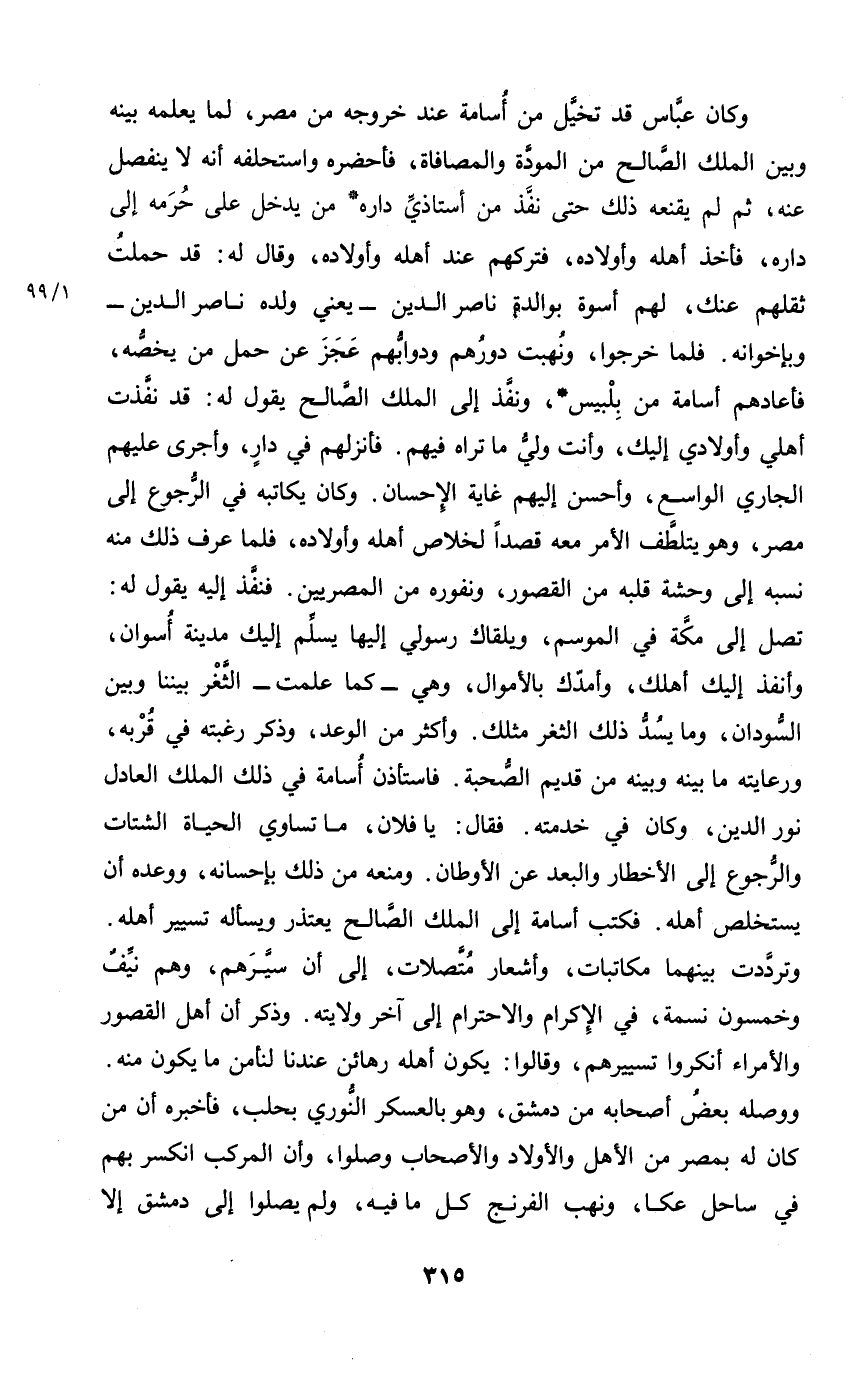 وَكَانَ عَبَّاس قد تخيل من أُسَامَة عِنْد خُرُوجه من مصر لما يُعلمهُ بَينه وَبَين الْملك الصَّالح من الْمَوَدَّة والمصافاة فَأحْضرهُ واستحلفه أَنه لَا ينْفَصل عَنهُ ثمَّ لم يقنعه ذَلِك حَتَّى نفذ من أستاذى دَاره من يدْخل على حرمه إِلَى دَاره فَأخذ أَهله وَأَوْلَاده فتركهم عِنْد أَهله وَأَوْلَاده وَقَالَ لَهُ قد حملت ثقلهم عَنْك لَهُم أُسْوَة بوالدة نَاصِر الدّين يَعْنِي وَلَده نَاصِر الدّين وبإخوانه