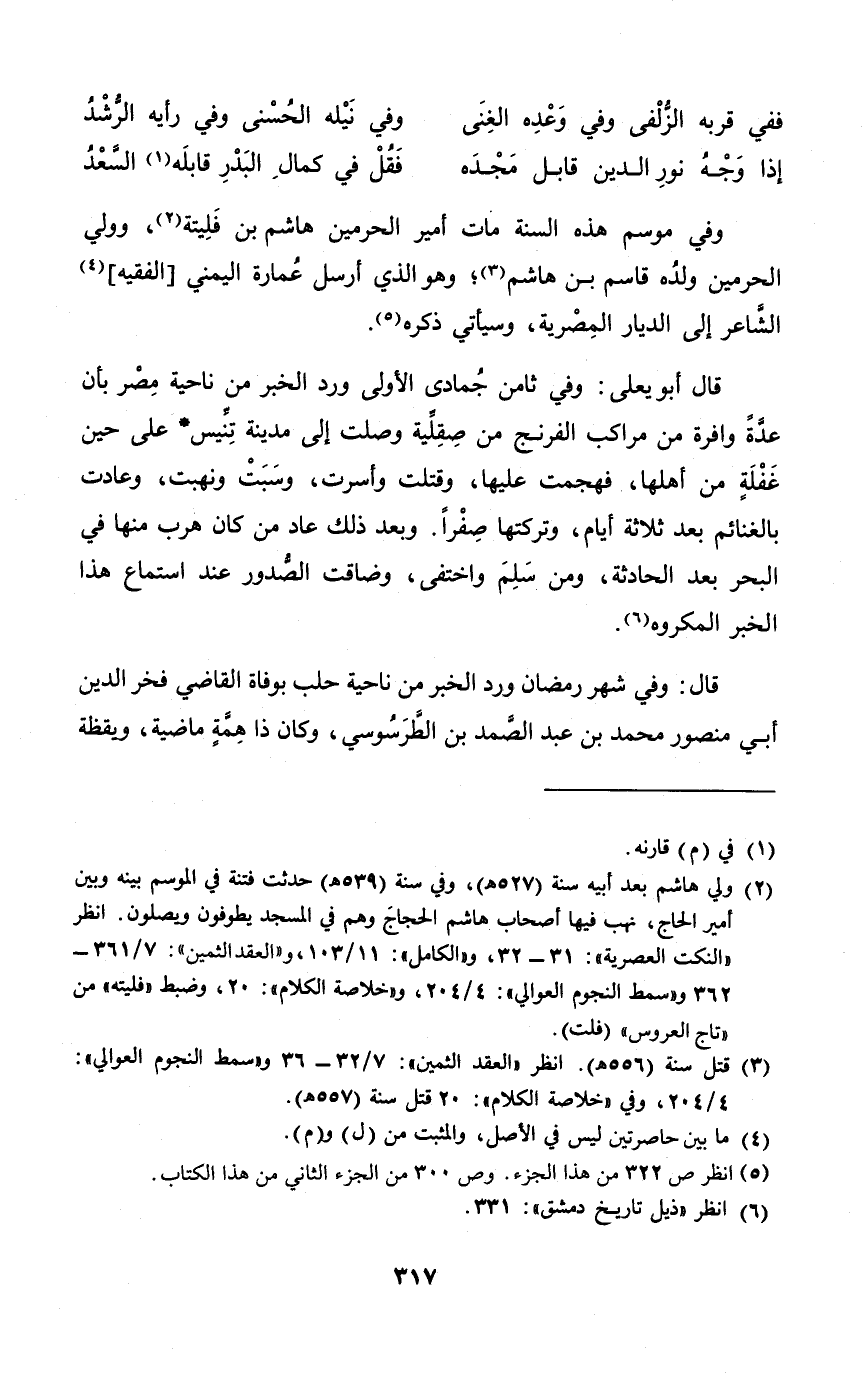 وَفِي موسم هَذِه السّنة مَاتَ أَمِير الْحَرَمَيْنِ هَاشم بن فليتة وَولى الْحَرَمَيْنِ وَلَده قَاسم بن هَاشم وَهُوَ الَّذِي أرسل عمَارَة الْيُمْنَى الْفَقِيه الشَّاعِر إِلَى الديار المصرية وَسَيَأْتِي ذكره