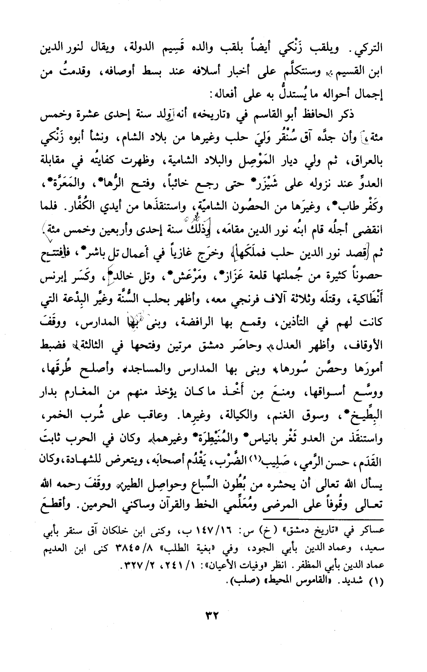 التركي ويلقب زنكي أَيْضا بلقب وَالِده قسيم الدولة وَيُقَال لنُور الدّين ابْن القسيم وسنتكلم على أَخْبَار أسلافه عِنْد بسط أَوْصَافه وقدمت من إِجْمَال أَحْوَاله مَا يسْتَدلّ بِهِ على أَفعاله
