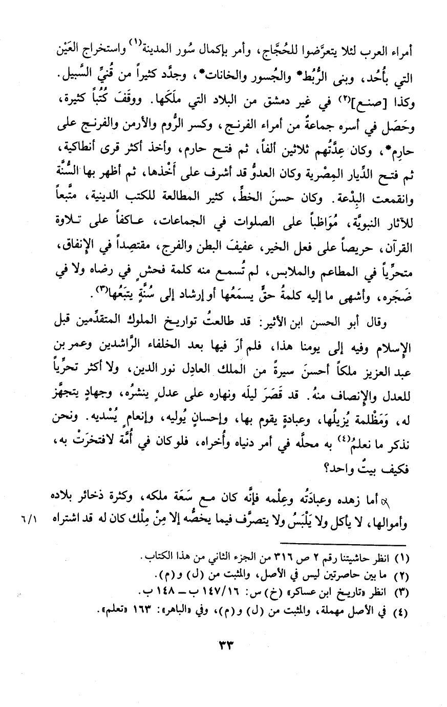 أُمَرَاء الْعَرَب لِئَلَّا يتَعَرَّضُوا للحجاج وَأمر بأكمال سور الْمَدِينَة واستخراج الْعين الَّتِي بِأحد وَبنى الرَّبْط والجسور والخانات وجدد كثيرا من قني السَّبِيل وَكَذَا صنع فِي غير دمشق من الْبِلَاد الَّتِي ملكهَا ووقف كتبا كَثِيرَة وَحصل فِي أسره جمَاعَة من أُمَرَاء الفرنج وَكسر الرّوم والأرمن والفرنج على حارم وَكَانَ عدتهمْ ثَلَاثِينَ ألفا ثمَّ فتح حارم وَأخذ أَكثر قرى أنطاكية ثمَّ فتح الديار المصرية وَكَانَ الْعَدو قد اشرف على أَخذهَا ثمَّ أظهر بهَا السّنة وانقمعت الْبِدْعَة وَكَانَ حسن الْخط كثير المطالعة للكتب الدِّينِيَّة مُتبعا للآثار النَّبَوِيَّة مواظبا على الصَّلَوَات فِي الْجَمَاعَات عاكفاً على تِلَاوَة الْقُرْآن حَرِيصًا على فعل الْخَيْر عفيف الْبَطن والفرج مقتصدا فِي الْإِنْفَاق متحريا فِي المطاعم والملابس لم تسمع مِنْهُ كلمة فحش فِي رِضَاهُ وَلَا فِي ضجره وأشهى مَا إِلَيْهِ كلمة حق يسْمعهَا أَو إرشاد إِلَى سنة يتبعهَا