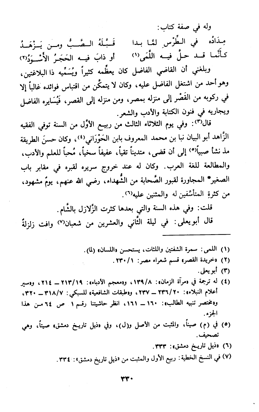 قَالَ وَفِي يَوْم الثُّلَاثَاء الثَّالِث من ربيع الأول من السّنة توفى الْفَقِيه الزَّاهِد أَبُو الْبَيَان نبا بن مُحَمَّد الْمَعْرُوف بِابْن الحوراني وَكَانَ حسن الطَّرِيقَة مذ نَشأ صَبيا إِلَى أَن قضى متدينا تقيا عفيفا سخيا محبا للْعلم وَالْأَدب والمطالعة للغة الْعَرَب