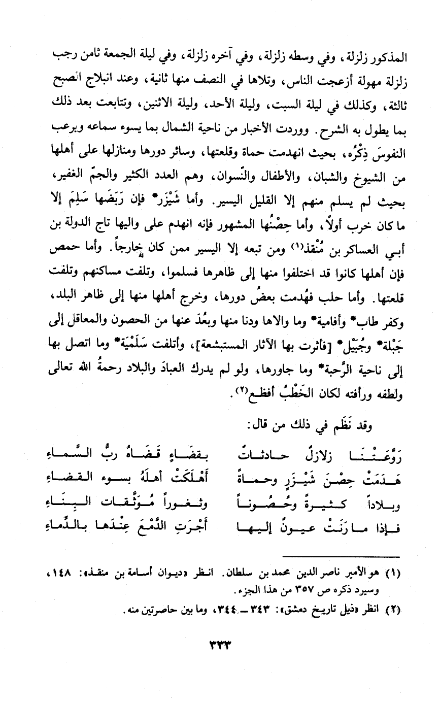 وَأما شيزر فَإِن ربضها سلم إِلَّا مَا كَانَ خرب أَولا وَأما حصنها الْمَشْهُور فَإِنَّهُ انْهَدم على واليها تَاج الدولة بن أبي العساكر بن منقذ وَمن تبعه إِلَّا الْيَسِير مِمَّن كَانَ خَارِجا