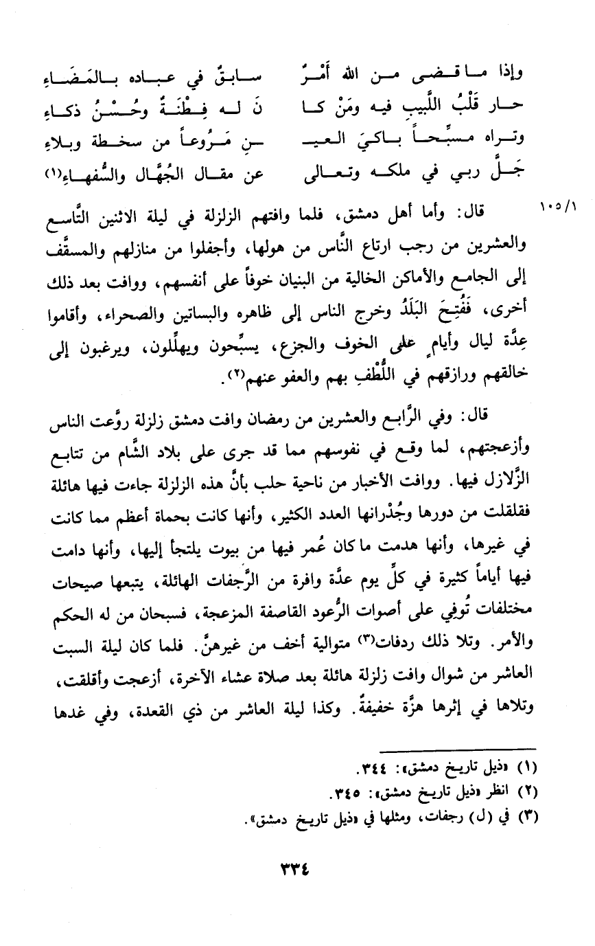 قَالَ وَأما أهل دمشق فَلَمَّا وافتهم الزلزلة فِي لَيْلَة الِاثْنَيْنِ التَّاسِع وَالْعِشْرين من رَجَب ارتاع النَّاس من هولها وأجفلوا من مَنَازِلهمْ والمسقف إِلَى الْجَامِع والأماكن الخالية من الْبُنيان خوفًا على أنفسهم ووافت بعد ذَلِك أُخْرَى فَفتح الْبَلَد وَخرج النَّاس إِلَى ظَاهره والبساتين والصحراء وَأَقَامُوا عدَّة لَيَال وَأَيَّام على الْخَوْف والجزع يسبحون ويهللون ويرغبون إِلَى خالقهم ورازقهم فِي اللطف بهم وَالْعَفو عَنْهُم