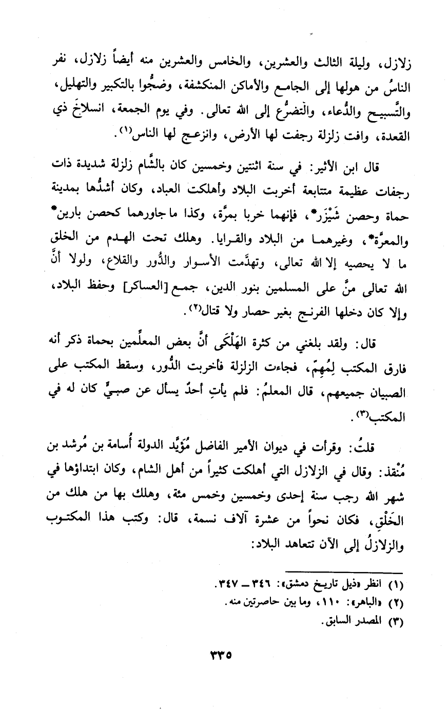 قلت وقرأت فِي ديوَان الْأَمِير الْفَاضِل مؤيد الدولة أُسَامَة بن مرشد بن منقذ وَقَالَ فِي الزلازل الَّتِي أهلكت كثيرا من أهل الشَّام وَكَانَ ابْتِدَاؤُهَا فِي شهر الله رَجَب سنة إِحْدَى وَخمسين وَخمْس مئة وَهلك بهَا من هلك من الْخلق فَكَانَ نَحوا من عشرَة آلَاف نسمَة قَالَ وَكتب هَذَا الْمَكْتُوب والزلازل إِلَى الْآن تتعاهد الْبِلَاد