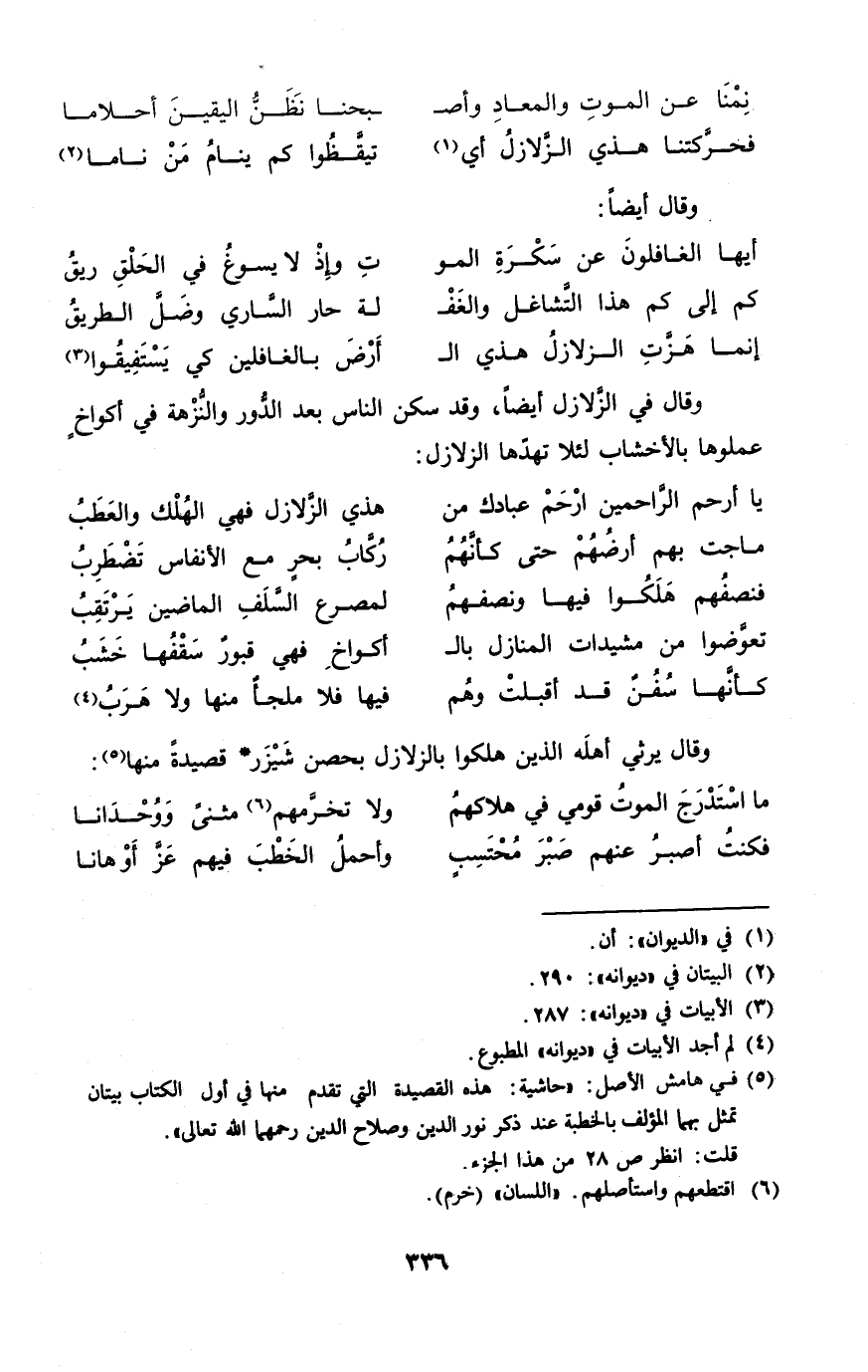 (فحركتنا هذى الزلازل أَي ... تيقظوا كم ينَام من نَامَا)