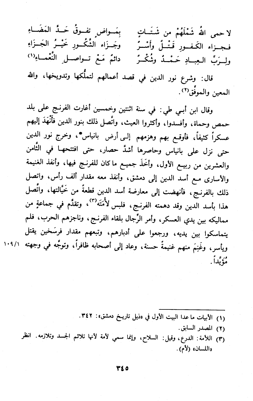 وَقَالَ ابْن أبي طي فِي سنة اثْنَتَيْنِ وَخمسين أغارت الفرنج على بلد حمص وحماة وافسدوا وَأَكْثرُوا العيث واتصل ذَلِك بِنور الدّين فأنهد إِلَيْهِم عسكرا كثيفا فأوقع بهم وَهَزَمَهُمْ إِلَى أَرض بانياس وَخرج نور الدّين حَتَّى نزل على بانياس وحاصرها أَشد حِصَار حَتَّى افتتحها فِي الثَّامِن وَالْعِشْرين من ربيع الأول وَأخذ جَمِيع مَا كَانَ للفرنج فِيهَا وأنفذ الْغَنِيمَة وَالْأسَارَى مَعَ أَسد الدّين إِلَى دمشق وأنفذ مَعَه مِقْدَار ألف رَأس واتصل ذَلِك بالفرنج فأنهضت إِلَى مُعَارضَة أَسد الدّين قِطْعَة من خيالتها واتصل هَذَا بأسد الدّين وَقد دهمته الفرنج فَلبس لأمته وَتقدم فِي جمَاعَة من مماليكه بَين يَدي الْعَسْكَر وَأمر الرِّجَال بلقاء الفرنج وناجزهم الْحَرْب فَلم يتماسكوا بَين يَدَيْهِ وَرَجَعُوا على أدبارهم وتبعهم مِقْدَار فرسخين يقتل ويأسر وغنم مِنْهُم غنيمَة حَسَنَة وَعَاد إِلَى أَصْحَابه ظافرا وَتوجه فِي وجهته مؤيدا