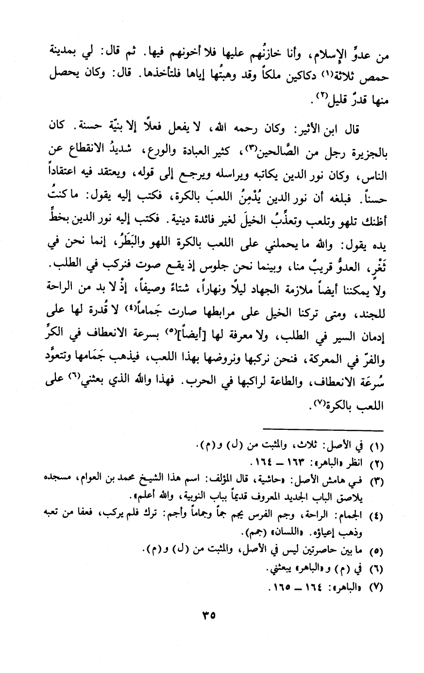 وَلَا يمكننا أَيْضا مُلَازمَة الْجِهَاد لَيْلًا وَنَهَارًا شتاء وصيفا إِذْ لابد من الرَّاحَة للجند وَمَتى تركنَا الْخَيل على مرابطها صَارَت جماما لَا قدرَة لَهَا على إدمان السّير فِي الطّلب وَلَا معرفَة لَهَا أَيْضا بِسُرْعَة الانعطاف فِي الْكر والفر فِي المعركة فَنحْن نركبها ونروضها بِهَذَا اللّعب فَيذْهب جمامها وتتعود سرعَة الانعطاف وَالطَّاعَة لراكبها فِي الْحَرْب فَهَذَا وَالله الَّذِي بَعَثَنِي على اللّعب بالكرة