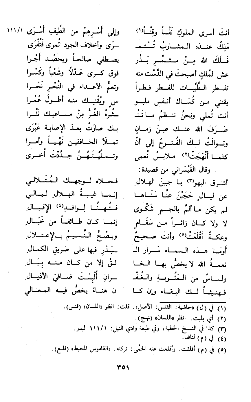 (أَنْت أسرى الْمُلُوك نفسا وقنسا ... وَإِلَى أسرهم من الطيف أسرى)