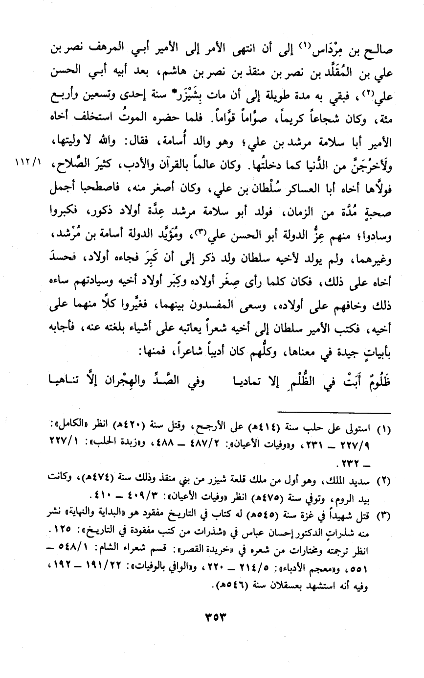 صَالح بن مرداس إِلَى أَن انْتهى الْأَمر إِلَى الْأَمِير أَبى المرهف نصر بن عَليّ بن الْمُقَلّد بن نصر بن منقذ بن نصر بن هَاشم بعد أَبِيه أَبى الْحسن عَليّ فبقى بِهِ مُدَّة طَوِيلَة إِلَى أَن مَاتَ بشيزر سنة إِحْدَى وَتِسْعين وَأَرْبع مئة وَكَانَ شجاعا كَرِيمًا صواما قواما