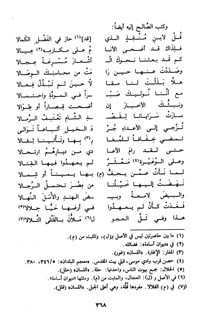 (قل لِابْنِ منقذ الَّذِي ... قد حَاز فِي الْفضل الكمالا)