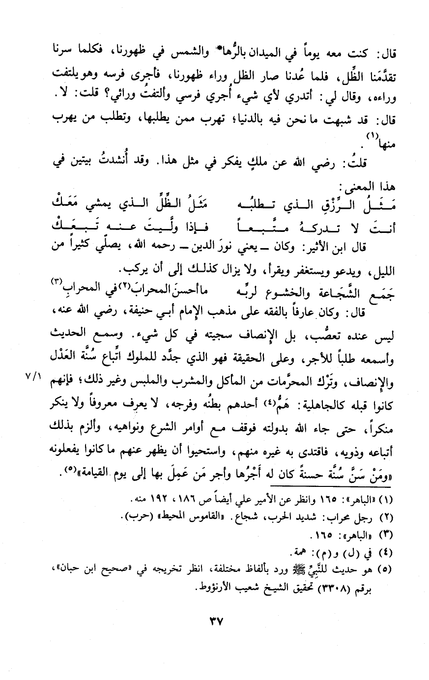 قَالَ كنت مَعَه يَوْمًا فِي الميدان بالرها وَالشَّمْس فِي ظُهُورنَا فَكلما سرنا تقدمنا الظل فَلَمَّا عدنا صَار الظل وَرَاء ظُهُورنَا فاجرى فرسه وَهُوَ يلْتَفت وَرَاءه وَقَالَ لي أَتَدْرِي لأي شَيْء أجري فرسي وألتفت ورائي قلت لَا قَالَ قد شبهت مَا نَحن فِيهِ بالدنيا تهرب مِمَّن يطْلبهَا وتطلب من يهرب مِنْهَا