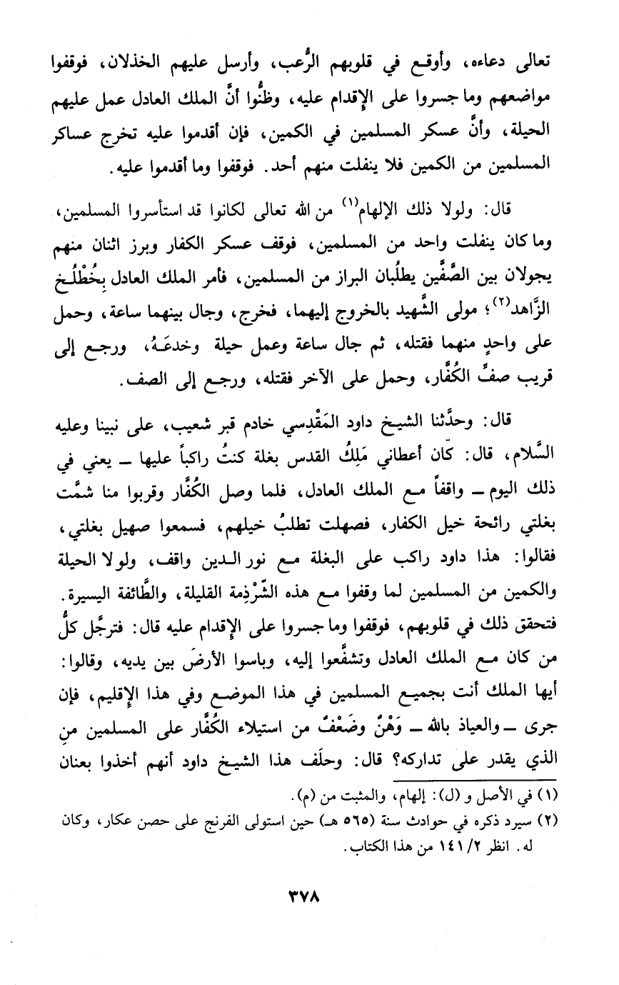 قَالَ وَحدثنَا الشَّيْخ دَاوُد الْمَقْدِسِي خَادِم قبر شُعَيْب على نَبينَا وَعَلِيهِ السَّلَام قَالَ كَانَ أَعْطَانِي ملك الْقُدس بغلة كنت رَاكِبًا عَلَيْهَا يَعْنِي فِي ذَلِك الْيَوْم وَاقِفًا مَعَ الْملك الْعَادِل فَلَمَّا وصل الْكفَّار وقربوا منا شمت بغلتي رَائِحَة خيل الْكفَّار فصهلت تطلب خيلهم فَسَمِعُوا صَهِيل بغلتي فَقَالُوا هَذَا دَاوُد رَاكب على البغلة مَعَ نور الدّين وَاقِف وَلَوْلَا الْحِيلَة والكمين من الْمُسلمين لما وقفُوا مَعَ هَذِه الشرذمة القليلة والطائفة الْيَسِيرَة فتحقق ذَلِك فِي قُلُوبهم فوقفوا وَمَا جسروا على الْإِقْدَام عَلَيْهِ قَالَ فترجل كل من كَانَ مَعَ الْملك الْعَادِل وتشفعوا إِلَيْهِ وباسوا الأَرْض بَين يَدَيْهِ وَقَالُوا أَيهَا الْملك أَنْت بِجَمِيعِ الْمُسلمين فِي هَذَا الْموضع وَفِي هَذَا الإقليم فَإِن جرى وَالْعِيَاذ بِاللَّه وَهن وَضعف من اسْتِيلَاء الْكفَّار على الْمُسلمين من الَّذِي يقدر على تَدَارُكه قَالَ وَحلف هَذَا الشَّيْخ دَاوُد أَنهم أخذُوا بعنان