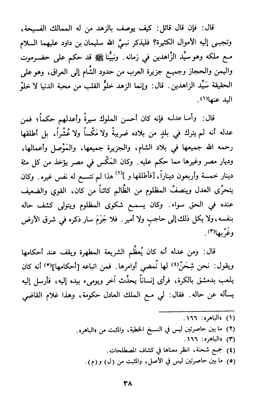 قَالَ وَأما عدله فَإِنَّهُ كَانَ أحسن الْمُلُوك سيرة وأعدلهم حكما فَمن عدله أَنه لم يتْرك فِي بلد من بِلَاده ضريبة وَلَا مكسا وَلَا عشرا بل أطلقها رَحْمَة الله جَمِيعهَا فِي بِلَاد الشَّام والجزيرة جَمِيعهَا والموصل وأعمالها وديار مصر وَغَيرهَا مِمَّا حكم عَلَيْهِ وَكَانَ المكس فِي مصر يُؤْخَذ من كل مئة دِينَار خَمْسَة وَأَرْبَعُونَ دِينَارا فأطلقها وَهَذَا لم تتسع لَهُ نفس غَيره