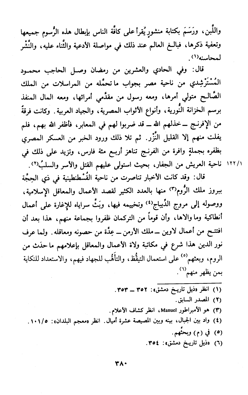 قَالَ وَقد كَانَت الْأَخْبَار تناصرت من نَاحيَة الْقُسْطَنْطِينِيَّة فِي ذِي الْحجَّة ببروز ملك الرّوم مِنْهَا بِالْعدَدِ الْكثير لقصد الْأَعْمَال والمعاقل الإسلامية ووصوله إِلَى مروج الديباج وتخييمه فِيهَا وَبث سراياه للإغارة على أَعمال أنطاكية وَمَا والاها وَأَن قوما من التركمان ظفروا بِجَمَاعَة مِنْهُم هَذَا بعد أَن افْتتح من أَعمال لاوين ملك الأرمن عدَّة من حصونه ومعاقله