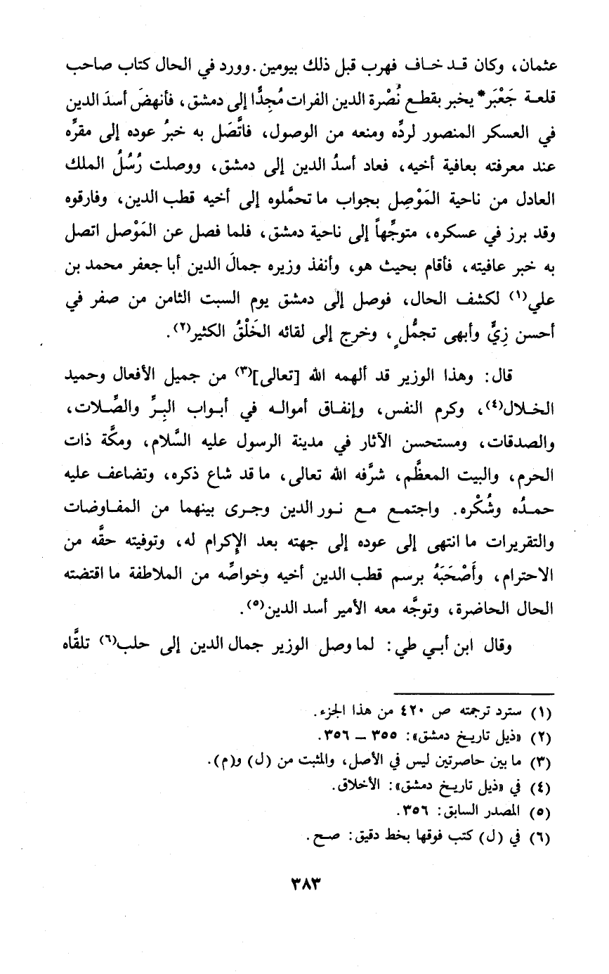 وَورد فِي الْحَال = كتاب صَاحب قلعة جعبر = يخبر بِقطع نصْرَة الدّين الْفُرَات مجدا إِلَى دمشق فأنهض أَسد الدّين فِي الْعَسْكَر الْمَنْصُور لرده وَمنعه من الْوُصُول فاتصل بِهِ خبر عوده إِلَى مقره عِنْد مَعْرفَته بعافية أَخِيه فَعَاد أَسد الدّين إِلَى دمشق ووصلت رسل الْملك الْعَادِل من نَاحيَة الْموصل بِجَوَاب مَا تَحملُوهُ إِلَى أَخِيه قطب الدّين وفارقوه وَقد برز فِي عسكره مُتَوَجها إِلَى نَاحيَة دمشق فَلَمَّا فصل عَن الْموصل اتَّصل بِهِ خبر عافيته فَأَقَامَ بِحَيْثُ هُوَ وأنفذ وزيره جمال الدّين أَبَا جَعْفَر مُحَمَّد بن عَليّ لكشف الْحَال فوصل إِلَى دمشق يَوْم السبت الثَّامِن من صفر فِي أحسن زِيّ وأبهى تجمل وَخرج إِلَى لِقَائِه الْخلق الْكثير