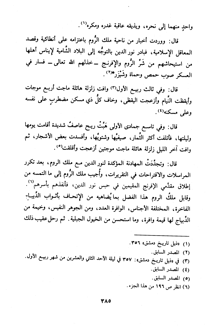 قَالَ وتجددت المهادنة الْمُؤَكّدَة لنُور الدّين مَعَ ملك الرّوم بعد تكَرر المراسلات والاقتراحات فِي التقريرات وَأجِيب ملك الرّوم إِلَى مَا التمسه من إِطْلَاق مقدمي الإفرنج المقيمين فِي حبس نور الدّين فأنفذهم بأسرهم