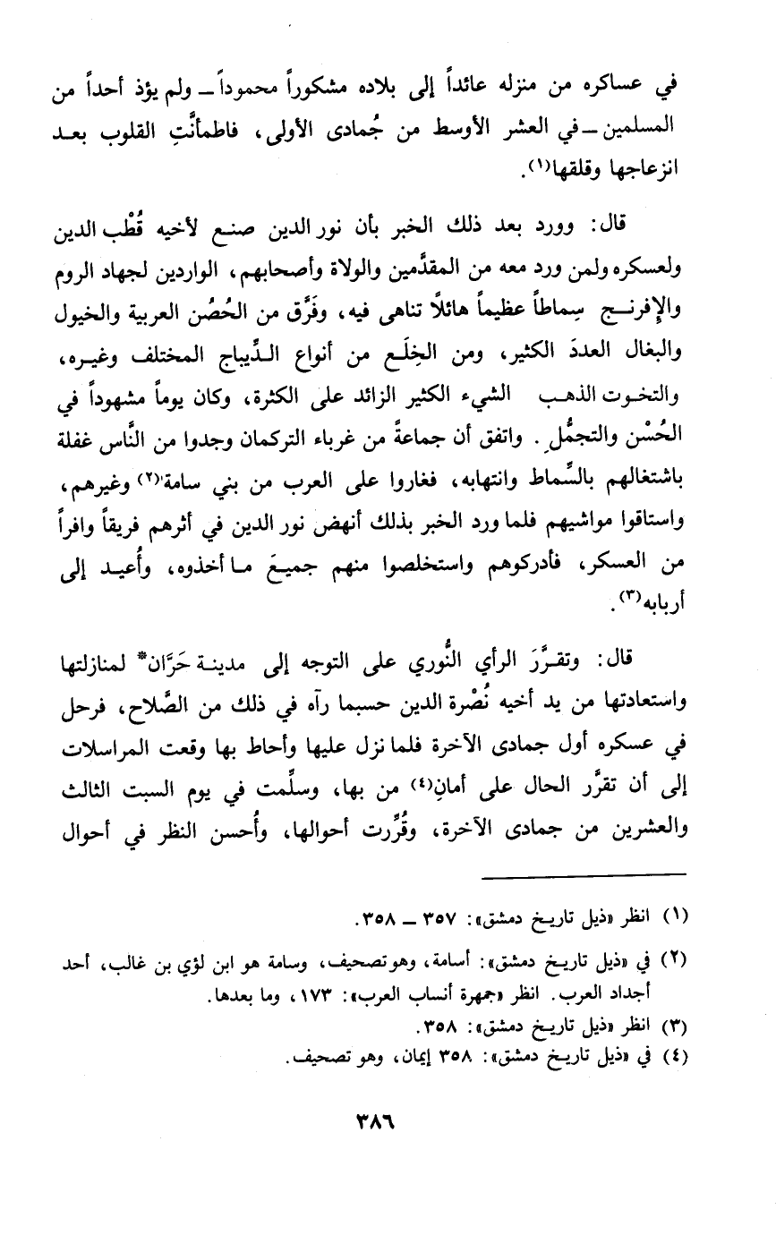 وَاتفقَ أَن جمَاعَة من غرباء التركمان وجدوا من النَّاس غَفلَة باشتغالهم بالسماط وانتهابه فغاروا على الْعَرَب من بني سامة وَغَيرهم وَاسْتَاقُوا مَوَاشِيهمْ فَلَمَّا ورد الْخَبَر بذلك أنهض نور الدّين فِي أَثَرهم فريقا وافرا من الْعَسْكَر فأدركوهم واستخلصوا مِنْهُم جَمِيع مَا أَخَذُوهُ وأعيد إِلَى أربابه