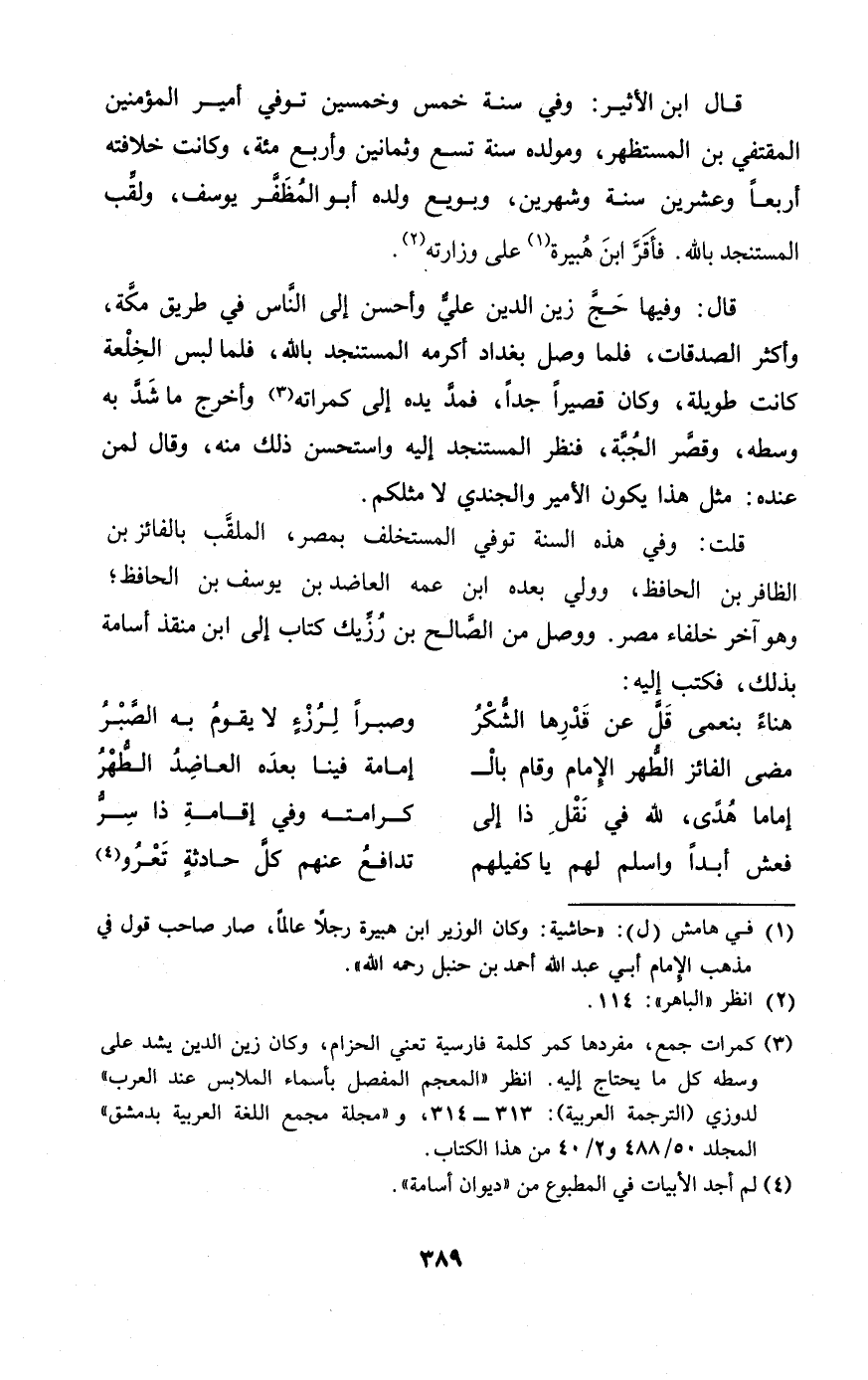 قَالَ ابْن الْأَثِير وَفِي سنة خمس وَخمسين توفّي أَمِير الْمُؤمنِينَ المقتفي بن المستظهر ومولده سنة تسع وَثَمَانِينَ وَأَرْبع مئة وَكَانَت خِلَافَته أَرْبعا وَعشْرين سنة وشهرين وبويع وَلَده أَبُو المظفر يُوسُف ولقب المستنجد بِاللَّه فَأقر ابْن هُبَيْرَة على وزارته