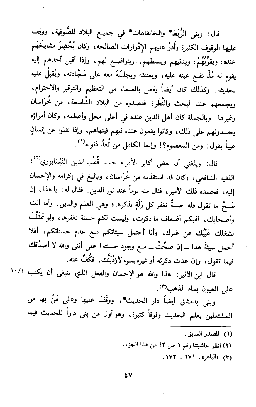 قَالَ وَبَلغنِي أَن بعض أكَابِر الْأُمَرَاء حسد قطب الدّين النَّيْسَابُورِي الْفَقِيه الشَّافِعِي وَكَانَ قد استقدمه من خُرَاسَان وَبَالغ فِي إكرامه وَالْإِحْسَان إِلَيْهِ فحسده ذَلِك الْأَمِير فنال مِنْهُ يَوْمًا عِنْد نور الدّين فَقَالَ لَهُ يَا هَذَا إِن صَحَّ مَا تَقول فَلهُ حَسَنَة تغْفر كل زلَّة تذكرها وَهِي الْعلم وَالدّين