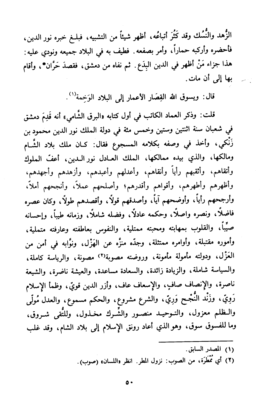قلت وَذكر الْعِمَاد الْكَاتِب فِي أَوله كِتَابه الْبَرْق الشَّامي أَنه قدم دمشق فِي شعْبَان سنة اثْنَتَيْنِ وَسِتِّينَ وَخمسين مئة فِي دولة الْملك نور الدّين مَحْمُود بن زنكي وَأخذ فِي وَصفه بِكَلَامِهِ المسجوع فَقَالَ كَانَ ملك بِلَاد الشَّام ومالكها وَالَّذِي بِيَدِهِ ممالكها الْملك الْعَادِل نور الدّين أعف الْمُلُوك وأتقاهم وأثقبهم رَأيا وأنقاهم وأعدلهم وأعبدهم وأزهدهم وأجهدهم وأظهرهم وأطهرهم وَأَقْوَاهُمْ وأقدرهم وأصلحهم عملا وأنجحهم أملا وأرجحهم رَأيا وأوضحهم آيا وأصدقهم قولا وأقصدهم طولا وَكَانَ عصره فَاضلا وَنَصره واصلا وَحكمه عادلا وفضله شَامِلًا وزمانه طيبا وإحسانه صيبا والقلوب بمهابته ومحبته ممتلية والنفوس بعاطفته وعارفته متملية وأموره مقتبلة وأوامره ممتثلة وجده منزه عَن الْهزْل ونوابه فِي أَمن من الْعَزْل ودولته مأمولة مَأْمُونَة وروضته مصوبة مصونة والرياسة كَامِلَة والسياسة شَامِلَة وَالزِّيَادَة زَائِدَة والسعادة مساعدة والعيشة ناضرة والشيعة ناصرة والإنصاف صَاف والإسعاف عاف وأزر الدّين قوي وظمأ الْإِسْلَام رُوِيَ وزند النجح وري وَالشَّرْع مَشْرُوع وَالْحكم مسموع وَالْعدْل مولى وَالظُّلم مَعْزُول والتوحيد مَنْصُور والشرك مخذول وللتقى شروق وَمَا للفسوق سوق وَهُوَ الَّذِي أعَاد رونق الْإِسْلَام إِلَى بِلَاد الشَّام وَقد غلب