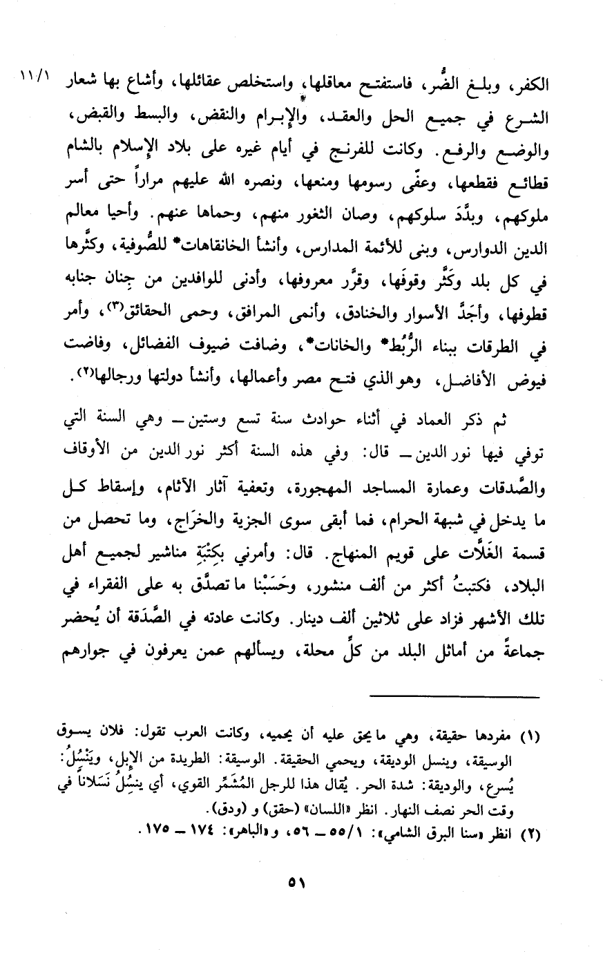 ثمَّ ذكر الْعِمَاد فِي أثْنَاء حوادث سنة تسع وَسِتِّينَ وَهِي السّنة الَّتِي توفى فِيهَا نور الدّين قَالَ وَفِي هَذِه السّنة أَكثر نور الدّين من الْأَوْقَاف وَالصَّدقَات وَعمارَة الْمَسَاجِد المهجورة وتعفيه آثَار الآثام وَإِسْقَاط كل مَا يدْخل فِي شُبْهَة الْحَرَام فَمَا أبقى سوى الْجِزْيَة وَالْخَرَاج وَمَا تحصل من قسْمَة الغلات على قويم الْمِنْهَاج قَالَ وَأَمرَنِي بكتبة مناشير لجَمِيع أهل الْبِلَاد فَكتبت أَكثر من ألف منشور وحسبنا مَا تصدق بِهِ على الْفُقَرَاء فِي تِلْكَ الْأَشْهر فَزَاد على ثَلَاثِينَ ألف دِينَار