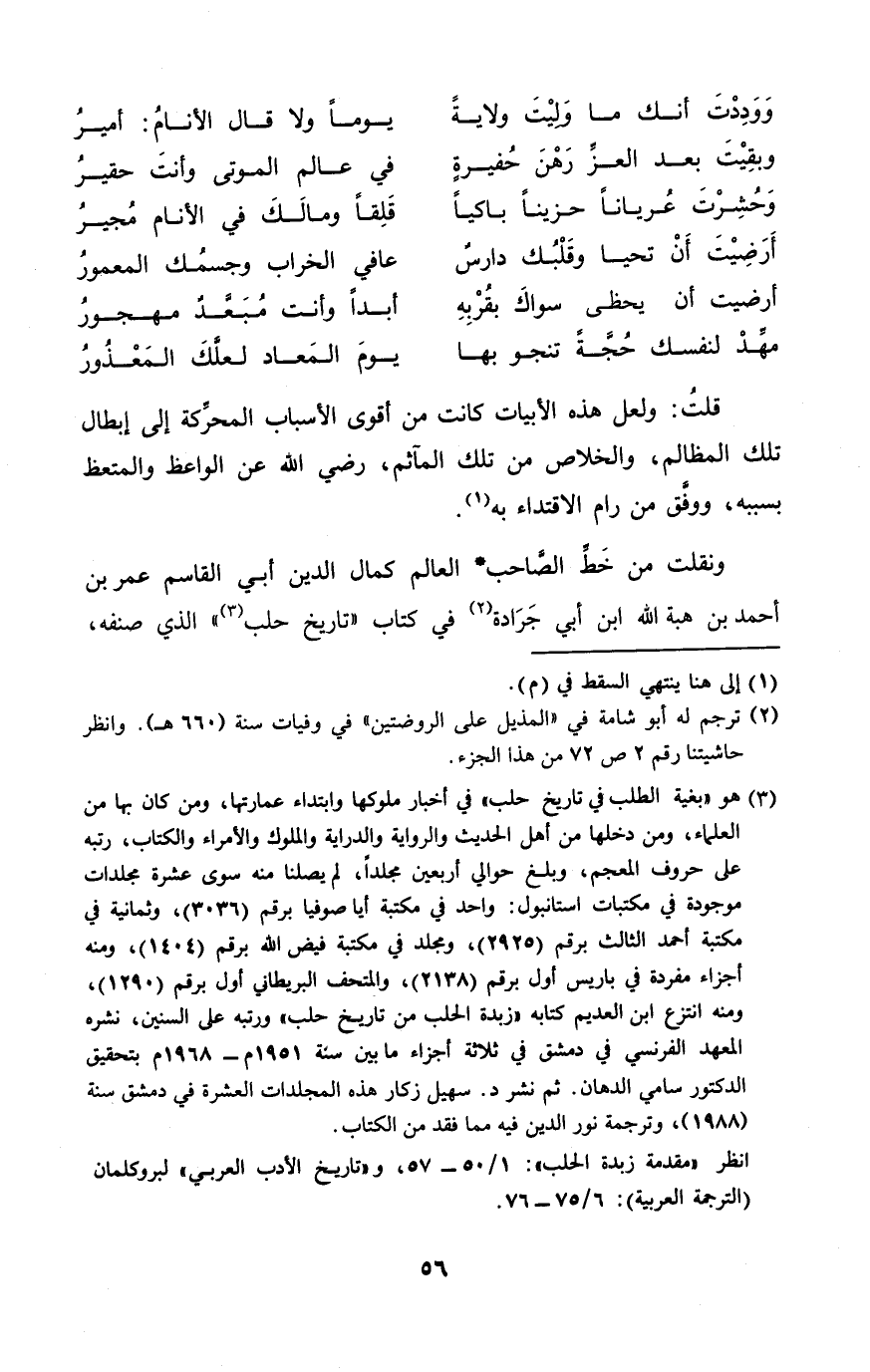 ونقلت من خطّ الصاحب الْعَالم كَمَال الدّين أبي الْقَاسِم عمر بن أَحْمد بن هبة الله ابْن أبي جَرَادَة فِي = كتاب تَارِيخ حلب = الَّذِي صنفه