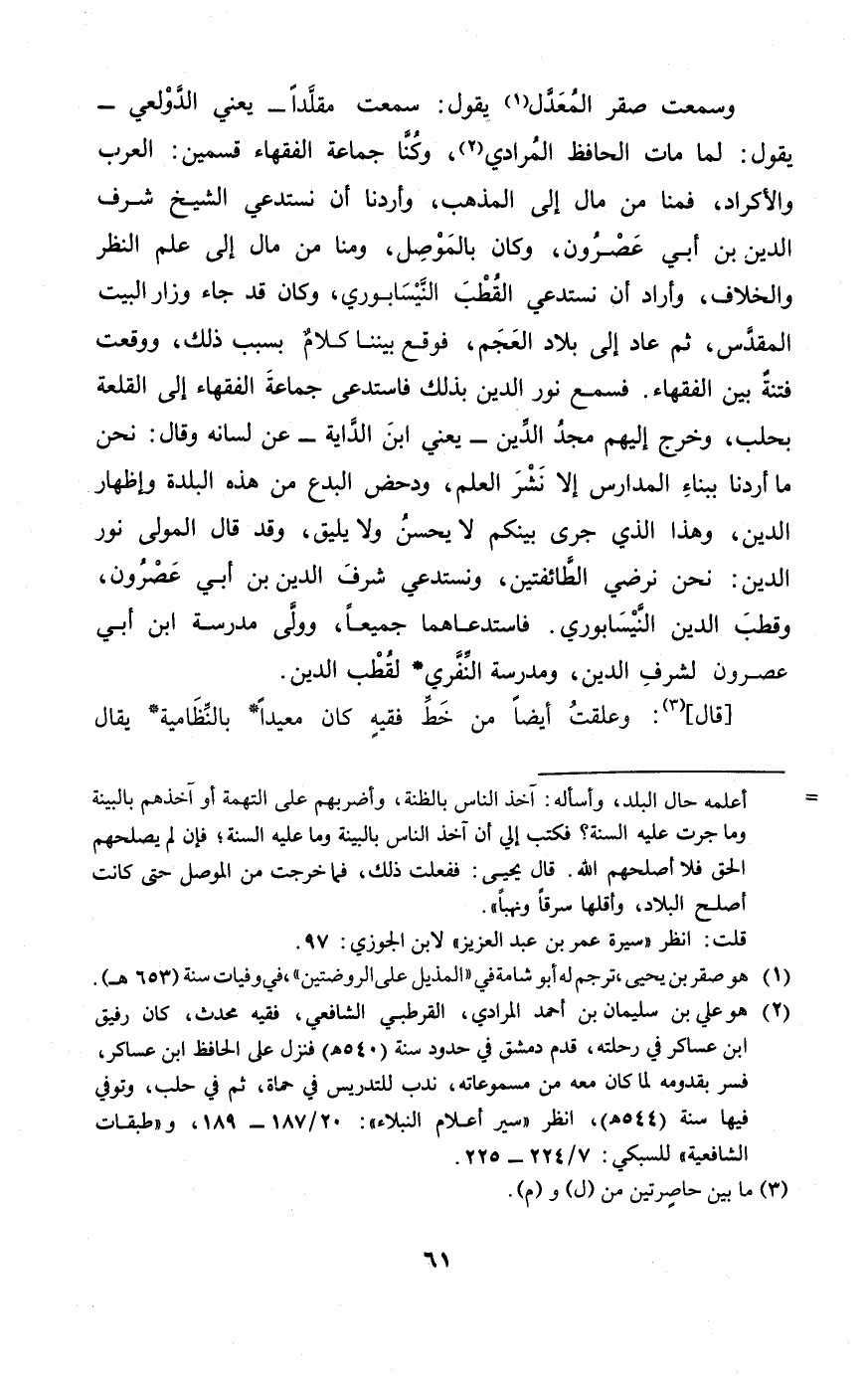 وَسمعت صقر الْمعدل يَقُول سَمِعت مُقَلدًا يَعْنِي الدولعي يَقُول لما مَاتَ الْحَافِظ الْمرَادِي وَكُنَّا جمَاعَة الْفُقَهَاء قسمَيْنِ الْعَرَب والأكراد فمنا من مَال إِلَى الْمَذْهَب وأردنا أَن نستدعي الشَّيْخ شرف الدّين بن أبي عصرون وَكَانَ بالموصل وَمنا من مَال إِلَى علم النّظر وَالْخلاف وَأَرَادَ أَن نستدعي القطب النَّيْسَابُورِي وَكَانَ قد جَاءَ وزار الْبَيْت الْمُقَدّس ثمَّ عَاد إِلَى بِلَاد الْعَجم فَوَقع بَيْننَا كَلَام بِسَبَب ذَلِك وَوَقعت فتْنَة بَين الْفُقَهَاء