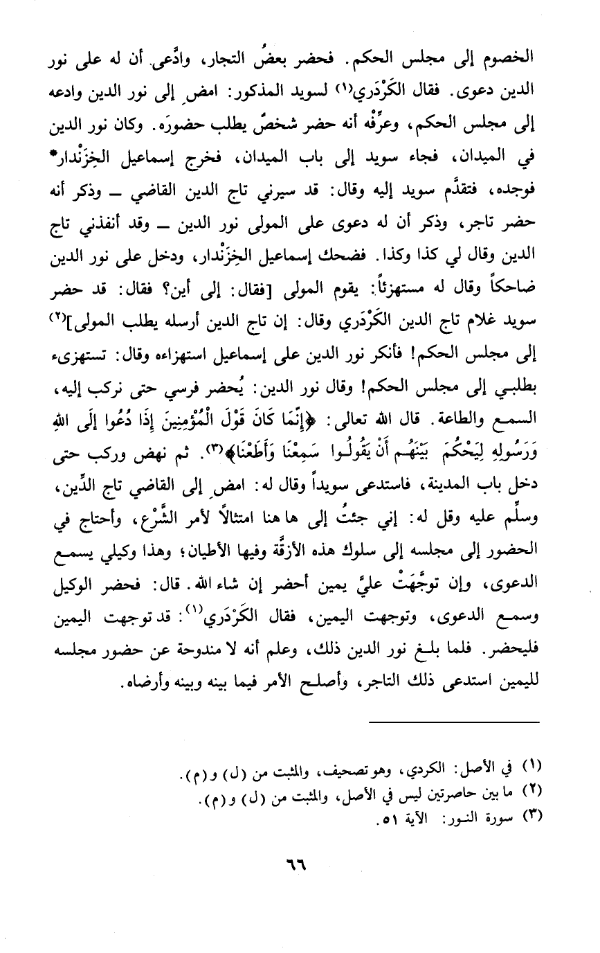 فَقَالَ الكردري لسويد الْمَذْكُور امْضِ إِلَى نور الدّين وادعه إِلَى مجْلِس الحكم وعرفه أَنه حضر شخص يطْلب حُضُوره وَكَانَ نور الدّين فِي الميدان فجَاء سُوَيْد إِلَى بَاب الميدان فَخرج إِسْمَاعِيل الخزندار فَوَجَدَهُ فَتقدم سُوَيْد إِلَيْهِ وَقَالَ قد سيرني تَاج الدّين القَاضِي وَذكر أَنه حضر تَاجر وَذكر أَن لَهُ دَعْوَى على الْمولى نور الدّين وَقد أنفذني تَاج الدّين وَقَالَ لي كَذَا وَكَذَا فَضَحِك إِسْمَاعِيل الخزندار وَدخل على نور الدّين ضَاحِكا وَقَالَ لَهُ مستهزئا يقوم الْمولى فَقَالَ إِلَى أَيْن فَقَالَ قد حضر سُوَيْد غُلَام تَاج الدّين الكردري وَقَالَ إِن تَاج الدّين أرْسلهُ يطْلب الْمولى إِلَى مجْلِس الحكم فَأنْكر نور الدّين على إِسْمَاعِيل استهزاءه وَقَالَ تستهزئ بطلبي إِلَى مجْلِس الحكم وَقَالَ نور الدّين يحضر فرسي حَتَّى نركب إِلَيْهِ السّمع وَالطَّاعَة