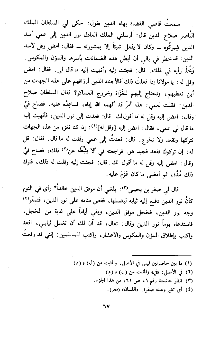 سَمِعت قَاضِي الْقُضَاة بهاء الدّين يَقُول حكى لي السُّلْطَان الْملك النَّاصِر صَلَاح الدّين قَالَ أَرْسلنِي الْملك الْعَادِل نور الدّين إِلَى عمي أَسد الدّين شيركوه وَكَانَ لَا يفعل شَيْئا إِلَّا بمشورته فَقَالَ امْضِ وَقل لأسد الدّين قد خطر فِي بالي أَن أبطل هَذِه الضمانات بأسرها والمؤن والمكوس