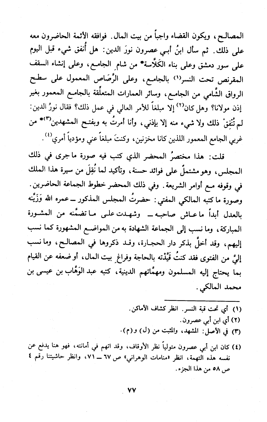 وَصُورَة مَا كتبه الْمَالِكِي الْمُفْتِي حضرت الْمجْلس الْمَذْكُور عمره الله وزينه بِالْعَدْلِ أبدا مَا عَاشَ صَاحبه وَشهِدت على مَا تضمنه من المشورة الْمُبَارَكَة وَمَا نسب إِلَى الْجَمَاعَة الشَّهَادَة بِهِ من الْمَوَاضِع الْمَشْهُورَة كَمَا نسب إِلَيْهِم وَقد أخل بِذكر دَار الْحِجَارَة وَقد ذكروها فِي الْمصَالح وَمَا نسب إِلَى من الْفَتْوَى فقد كنت قيدته بِالْحَاجةِ وفراغ بَيت المَال أَو ضعفه عَن الْقيام بِمَا يحْتَاج إِلَيْهِ الْمُسلمُونَ ومهماتهم الدِّينِيَّة كتبه عبد الْوَهَّاب بن عِيسَى بن مُحَمَّد الْمَالِكِي