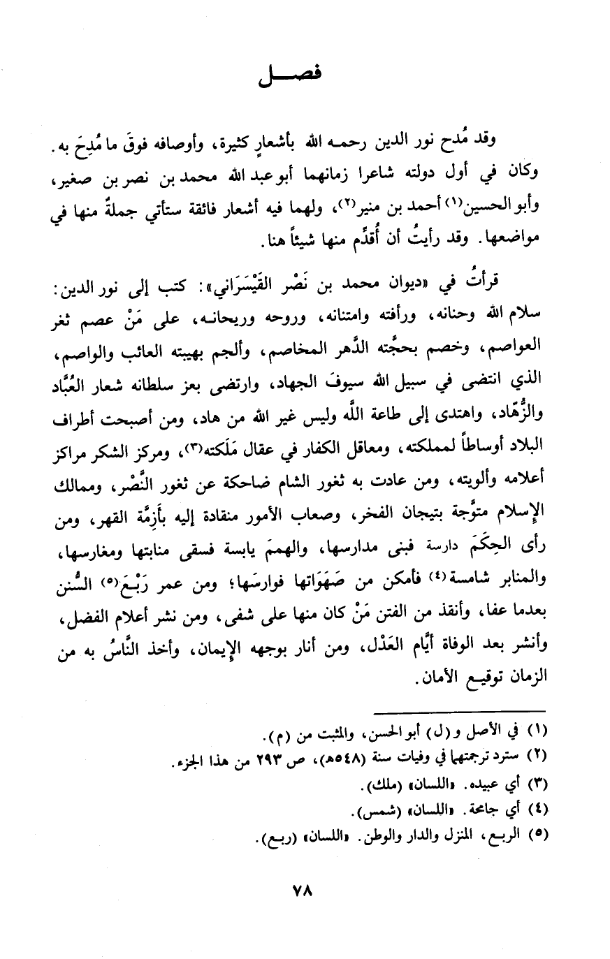 قَرَأت فِي ديوَان مُحَمَّد بن نصر القيسراني كتب إِلَى نور الدّين سَلام الله وحنانه ورأفته وامتنانه وروحه وريحانه على من عصم ثغر العواصم وخصم بحجته الدَّهْر المخاصم وألجم بهيبته العائب والواصم الَّذِي انتضى فِي سَبِيل الله سيوف الْجِهَاد وارتضى بعز سُلْطَانه شعار الْعباد والزهاد واهتدى إِلَى طَاعَة الله وَلَيْسَ غير الله من هاد وَمن أَصبَحت أَطْرَاف الْبِلَاد أوساطا لمملكته ومعاقل الْكفَّار فِي عقال ملكته ومركز الشُّكْر مراكز أَعْلَامه وألويته وَمن عَادَتْ بِهِ ثغور الشَّام ضاحكة عَن ثغور النَّصْر وممالك الْإِسْلَام متوجة بتيجان الْفَخر وصعاب الْأُمُور منقادة إِلَيْهِ بأزمة الْقَهْر وَمن رأى الحكم دارسة فَبنى مدارسها والهمم يابسة فسقى منابتها ومغارسها والمنابر شامسة فَأمكن من صهواتها فوارسها وَمن عمر ربع السّنَن بَعْدَمَا عَفا وأنقذ من الْفِتَن من كَانَ مِنْهَا على شفى وَمن نشر أَعْلَام الْفضل وأنشر بعد الْوَفَاة أَيَّام الْعدْل وَمن أنار بِوَجْهِهِ الْإِيمَان وَأخذ النَّاس بِهِ من الزَّمَان توقيع الْأمان