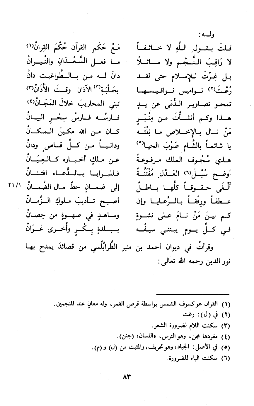 وقرأت فِي ديوَان أَحْمد بن مُنِير الطرابلسي من قصائد يمدح بهَا نور الدّين رَحمَه الله تَعَالَى