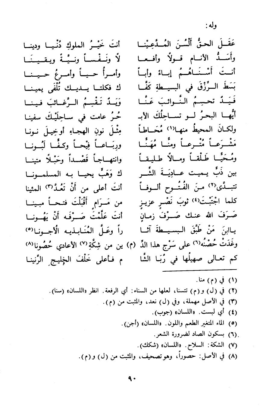 (عقل الْحق ألسن المدعينا ... أَنْت خير الْمُلُوك دنيا ودينا)