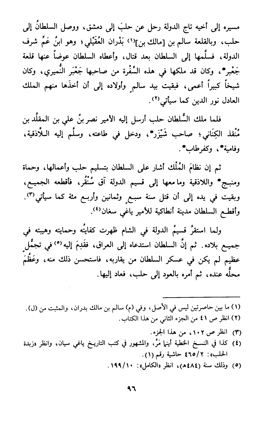 ثمَّ إِن السُّلْطَان استدعاه إِلَى الْعرَاق فَقدم إِلَيْهِ فِي تجمل عَظِيم لم يكن فِي عَسْكَر السُّلْطَان من يُقَارِبه فَاسْتحْسن ذَلِك مِنْهُ وَعظم مَحَله عِنْده ثمَّ أمره بِالْعودِ إِلَى حلب فَعَاد إِلَيْهَا