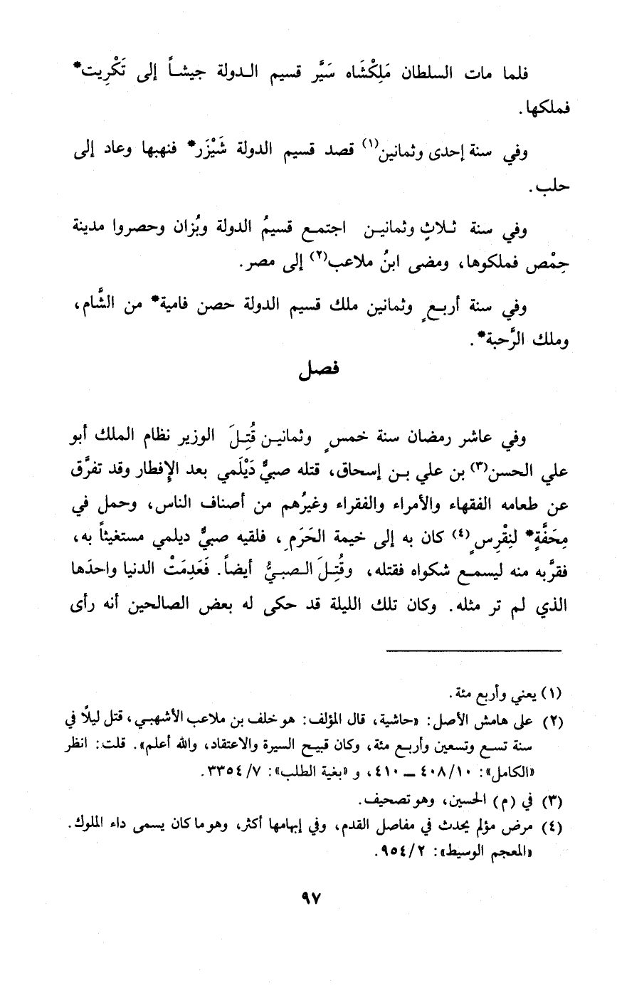 وَفِي عَاشر رَمَضَان سنة خمس وَثَمَانِينَ قتل الْوَزير نظام الْملك أَبُو عَليّ الْحسن بن عَليّ بن إِسْحَاق قَتله صبي ديلمي بعد الْإِفْطَار وَقد تفرق عَن طَعَامه الْفُقَهَاء والأمراء والفقراء وَغَيرهم من أَصْنَاف النَّاس وَحمل فِي محفة لنقرس كَانَ بِهِ إِلَى خيمة الْحرم فَلَقِيَهُ صبي ديلمي مستغيثا بِهِ فقربه مِنْهُ ليسمع شكواه فَقتله وَقتل الصَّبِي أَيْضا فعدمت الدُّنْيَا وَاحِدهَا الَّذِي لم تَرَ مثله