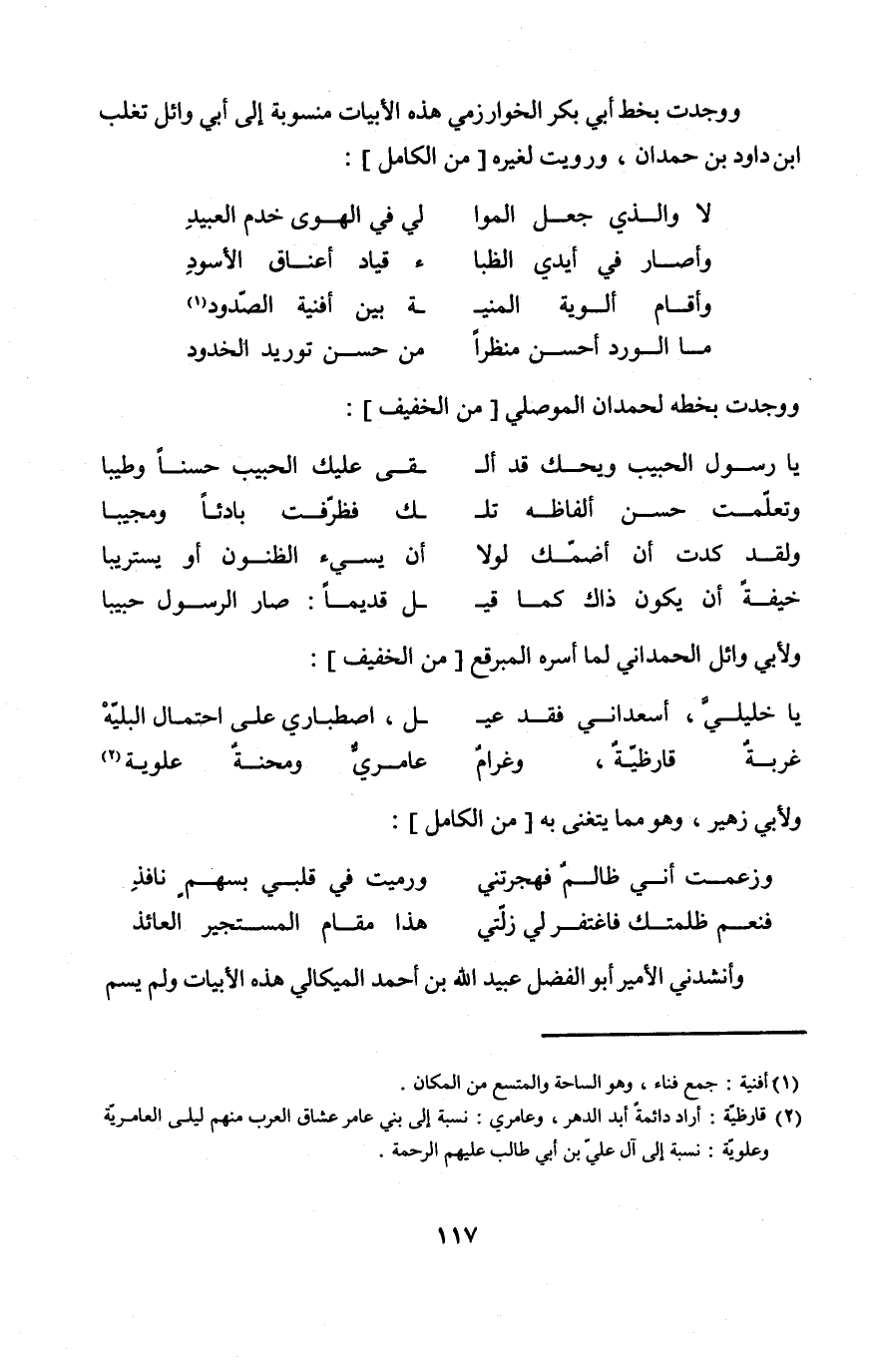 وَوجدت بِخَط أبي بكر الْخَوَارِزْمِيّ هَذِه الأبيات منسوبة إِلَى أبي وَائِل تغلب ابْن دَاوُد بن حمدَان وَرويت لغيره