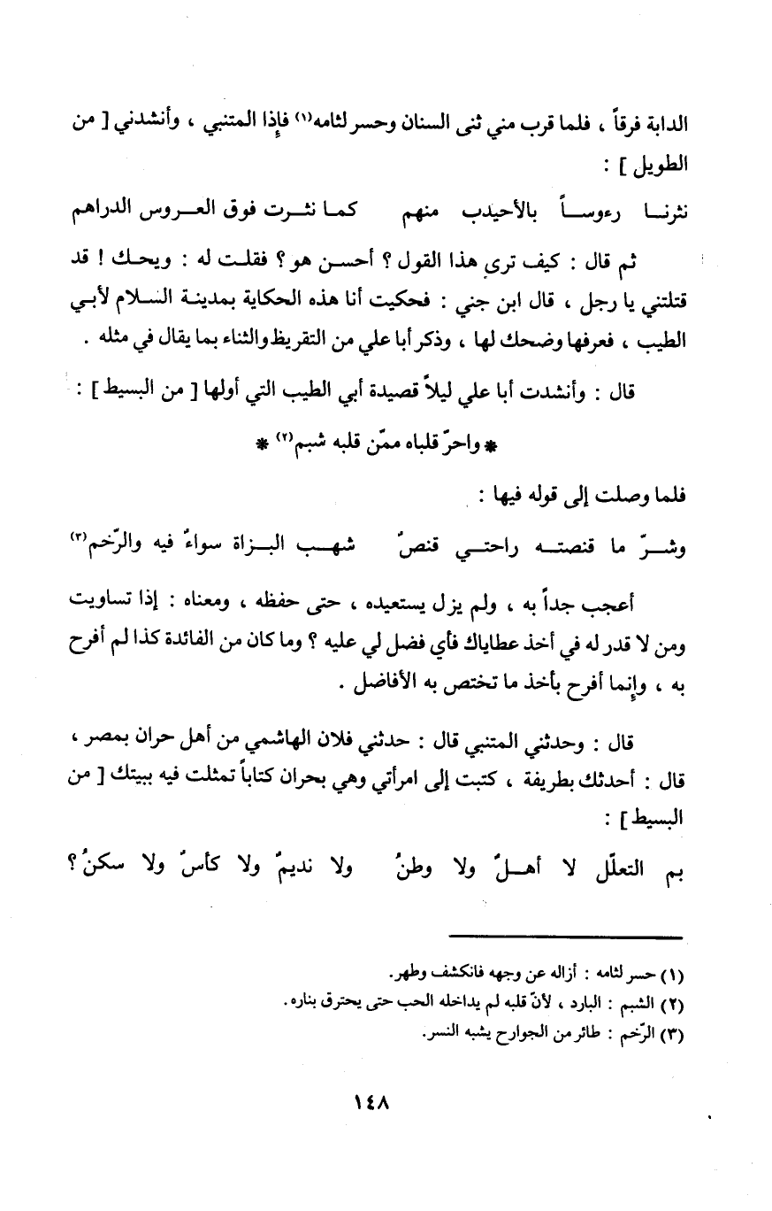 قَالَ وحَدثني المتنبي قَالَ حَدثنِي فلَان الْهَاشِمِي من أهل حران بِمصْر قَالَ أحَدثك بطريفة كتبت إِلَى امْرَأَتي وَهِي بحران كتابا تمثلت فِيهِ ببيتك
