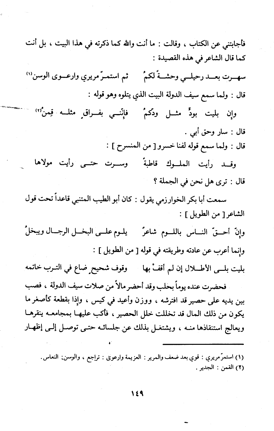 سَمِعت أَبَا بكر الْخَوَارِزْمِيّ يَقُول كَانَ أَبُو الطّيب المتنبي قَاعِدا تَحت قَول الشَّاعِر