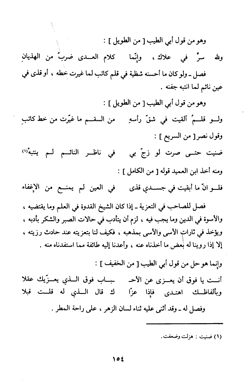 فصل للصاحب فِي التَّعْزِيَة إِذا كَانَ الشَّيْخ الْقدْوَة فِي الْعلم وَمَا يَقْتَضِيهِ والأسوة فِي الدّين وَمَا يجب فِيهِ لزم أَن يتأدب فِي حالات الصَّبْر وَالشُّكْر بأدبه وَيُؤْخَذ فِي ثَارَاتِ الأسى والأسى بمذهبه فَكيف لنا بتعزيته عِنْد حَادث رزيته إِلَّا إِذا روينَا لَهُ بعض مَا أخذناه عَنهُ وأعدنا إِلَيْهِ طَائِفَة مِمَّا استفدناه مِنْهُ